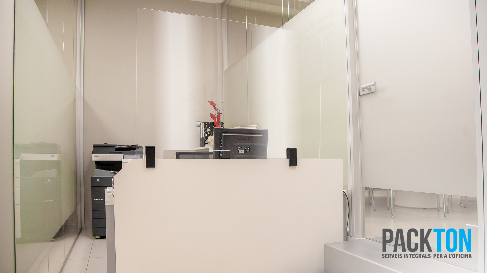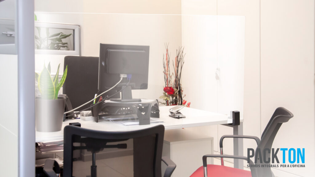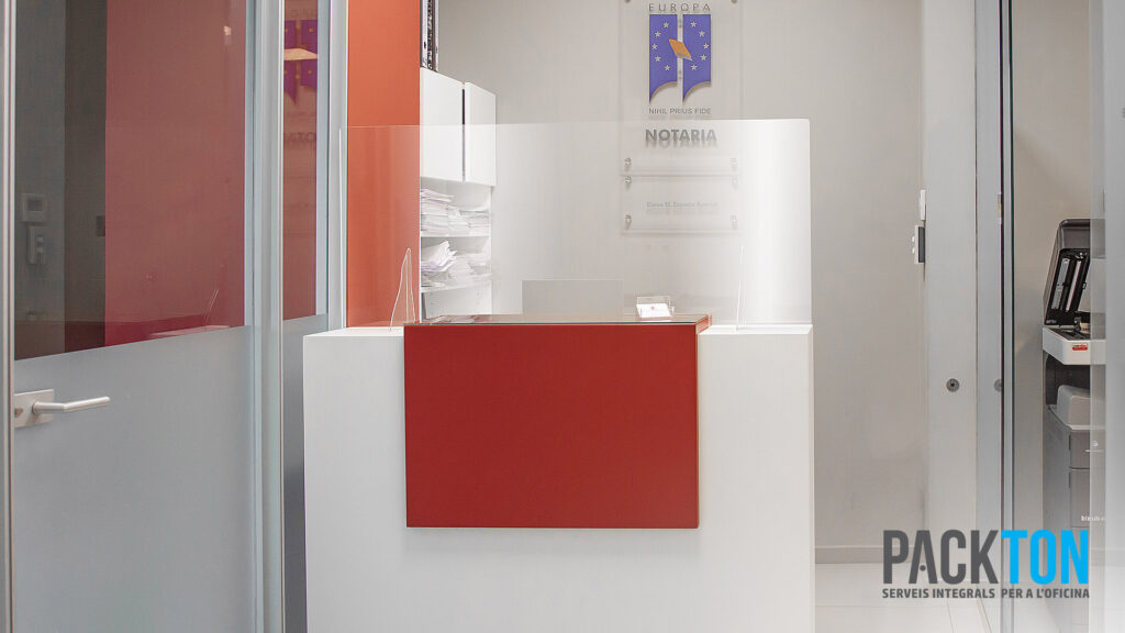 Packton, serveis integrals per a l’oficina, ha instal·lat 5 mampares de protecció als despatxos de la notaria de Ripoll, dirigida per Elena España. Les mampares són una eficaç barrera per evitar la propagació de la Covid-19 i estan fabricades en metacrilat i fetes a 100% a mida. La possibilitat de fer-les a mida permet trobar solucions eficaces: amb finestreta per a l’intercanvi de documents o amb suports fabricats en impressió 3D que s’adapten a totes les taules.